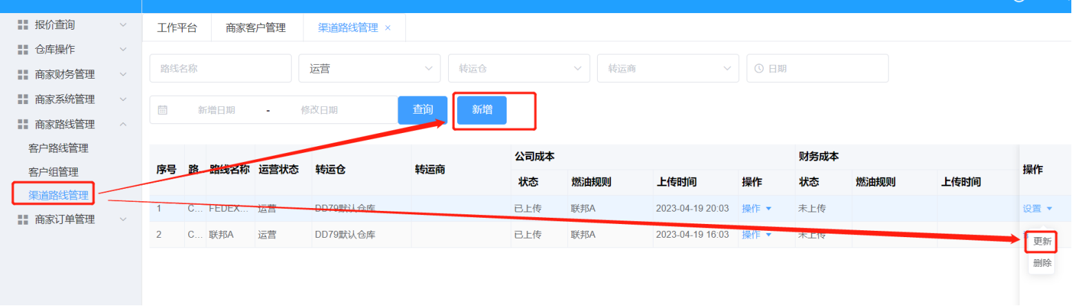 1.新增/修改----对接渠道比如FEDEX、UPS、华磊等    2.删除----删除渠道路线(会导致客户路线绑定的渠道路线也消失的)  3.公司成本/财务成本上传----公司成本用来计算公司的预计成本和利润,财务成本用来校验渠道账单金额