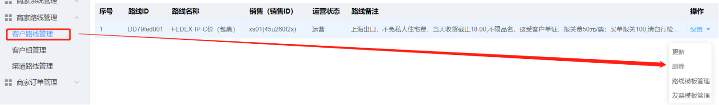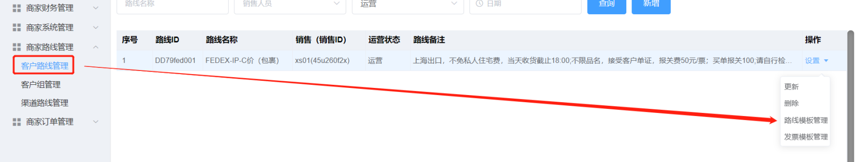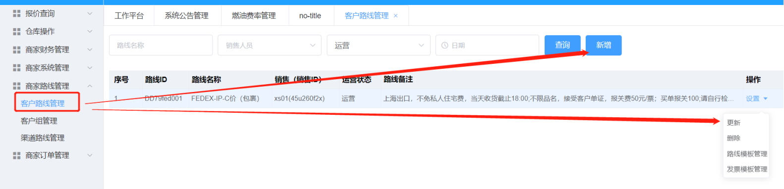 1.新增/修改----客户路线是给客户看的路线,可以对接多条渠道    2.删除----会连带客户组中的一起删除  3.路线模板管理----对下单页面的字段做限制