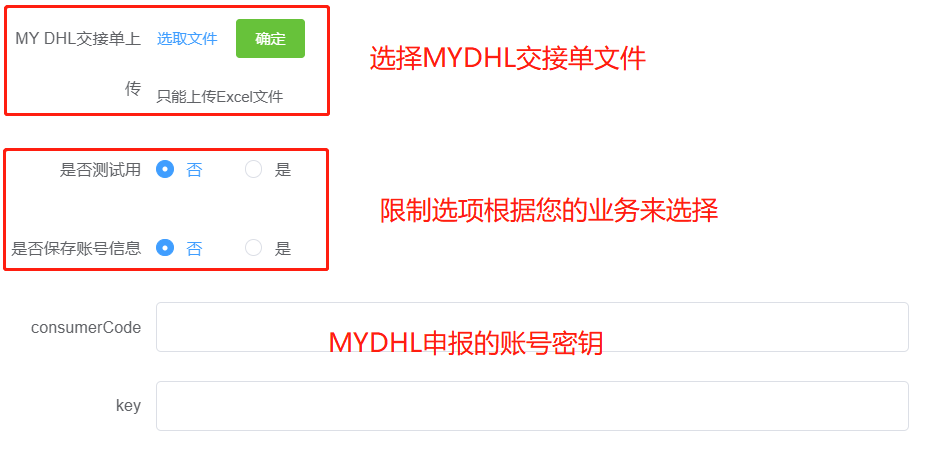 1.从小工具下载之前的模板或者下载一个新的模板   2.导入交接单模板   3.导出交接单   4.MYDHL EDI 需要有EDI上传账号密钥才可以成功