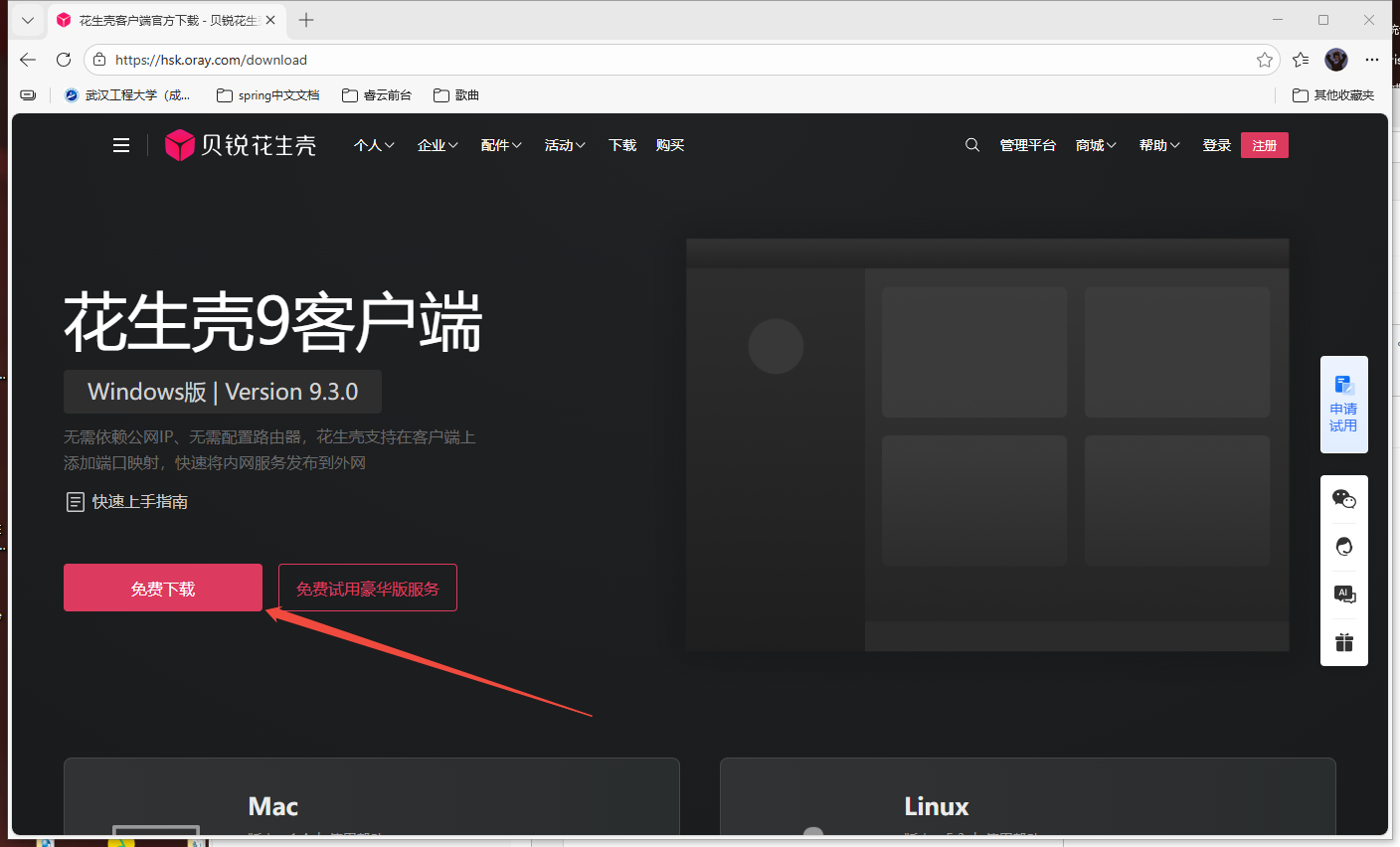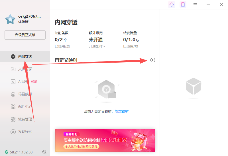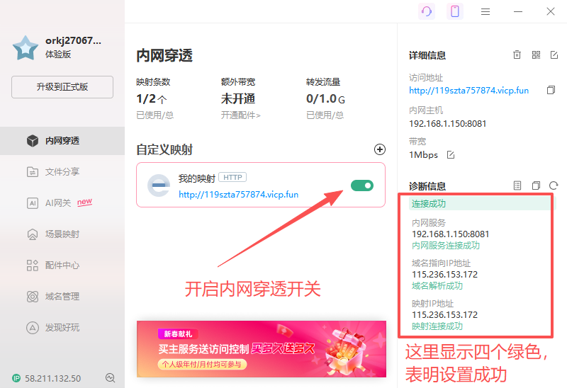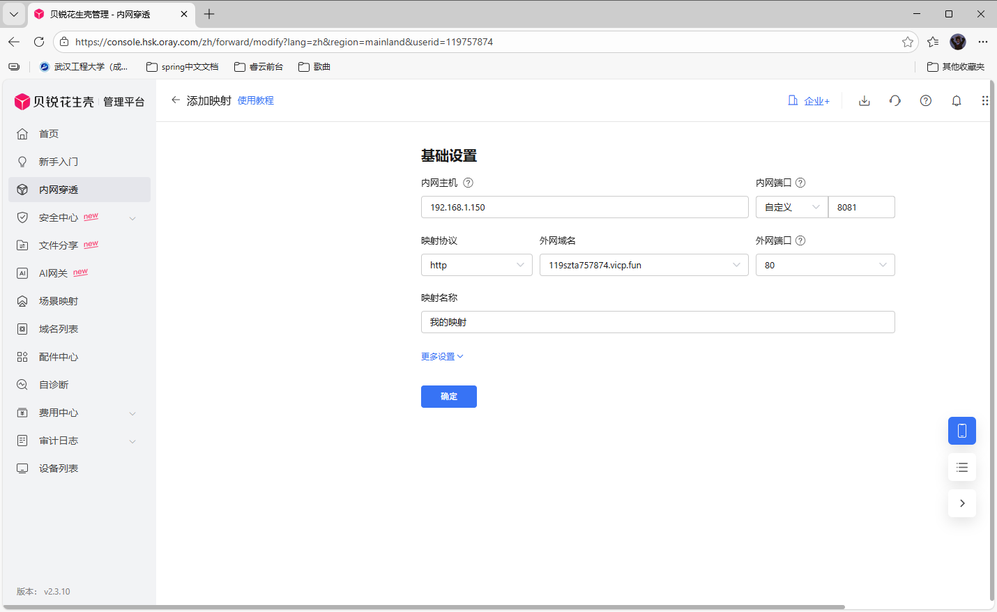 ## 睿云自建内网穿透 1. [下载服务](http://58.211.132.51:9000/public/proxy-client-0.1.zip) 2. 解压 3. 以文本方式 解压目录\conf\config.properties配置文件,按图片所示填写,填写完成后保存  4. 进入 解压目录\proxy-client-0.1\bin 双击 'startup.bat'运行服务 5. 联系客服,索要访问url 6. 访问客服提供的url,如图所示表明服务搭建成功  ## 花生壳(第三方服务) 1. [花生壳官网(点击跳转)](https://hsk.oray.com/download)  2. 安装 一直点击下一步即可 3. 账号注册,登入 4. 开始配置 4.1 内网穿透->单击'+'按钮  4.2 获取本地内网ip地址 同时按下win+r,在弹出的窗口输出cmd 然后回车  然后在出现的窗口输出‘ipconfig’  记住红色方框包围起来的内网地址'192.168.1.150'(实际操作这里可能不会是一样的,以您当前页面为准) 4.3 在4.1步骤打开的网页内网主机输入上一步获取的ip地址,这里我输入192.168.1.150 端口固定输入8081。映射协议选择http和https都行,外网域名选择一个能用的即可,端口号选择一个固定的  如图所示,点击确定。同时需要将映射协议外网域名和外网端口 以'映射协议://外网域名:外网端口'方式拼接(笔者这里拼接结果 '[http://119szta757874.vicp.fun:80](http://119szta757874.vicp.fun:80)')。后续需要使用。 4.4 回到花生壳软件  4.5 验证服务启动结果和内网穿透是否搭建成功 在浏览器访问4.4拼接的url('[http://119szta757874.vicp.fun:80](http://119szta757874.vicp.fun:80)')  浏览器如下显示,表示服务搭建成功